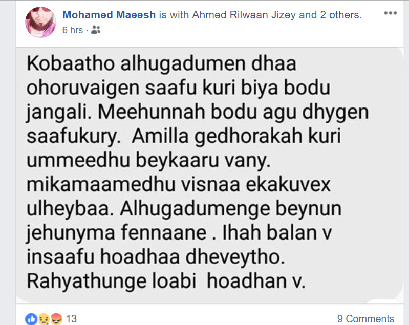 ޖަރީމާ ހިންގިކަމަށް ބުނެ އެޖަރީމާތައް ހިންގި މީހުންނަށް އަދަބު ދޭނެކަމަށާއި ގެވަޅު ނުދީގެން ޝޫރު ފާޅުކުރަނީ އެޖަރީމާގައި ބައިވެރިންކަމަށް ދޭހަވާ އިބާރާތަކުން އިހަވަންދޫ ކައުންސިލްގެ ބައެއް މެމްބަރުން ވަނީ ކޮމެންޓުކޮށްފައެވެ.